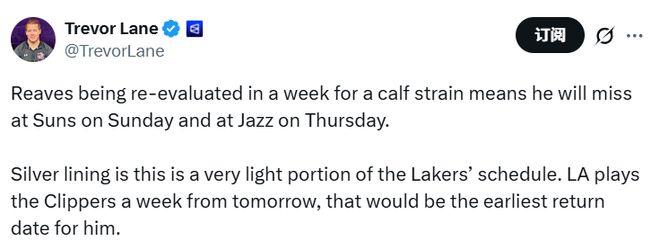 受NBA杯的影響,湖人未來一周只有兩場比賽,分別是12月15日客場對陣太陽以及12月19日客場對陣爵士。如果里夫斯能在一周后回歸,他預(yù)計會缺席這兩場比賽。他最快可以在下周對快船的比賽中復(fù)出。