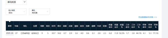 截至本賽季第九輪,龐崢麟場均可砍下18.2分3.6籃板4.9助攻,投籃命中率52.3%,三分命中率44.1%。該數(shù)據(jù)暫時在國家隊后衛(wèi)高詩巖、王嵐嵚、胡明軒、廖三寧之上。
