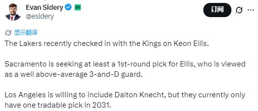 北京時(shí)間1月7日,據(jù)名記Sidery報(bào)道,湖人隊(duì)最近就基翁-埃利斯一事與國(guó)王隊(duì)進(jìn)行了談判。國(guó)王希望用埃利斯換來(lái)至少一個(gè)首輪簽,埃利斯被認(rèn)為是一名遠(yuǎn)高于平均水平的3D后衛(wèi)。湖人愿意將克內(nèi)希特加入交易,但他們目前只有2031年一個(gè)可交易的首輪簽。