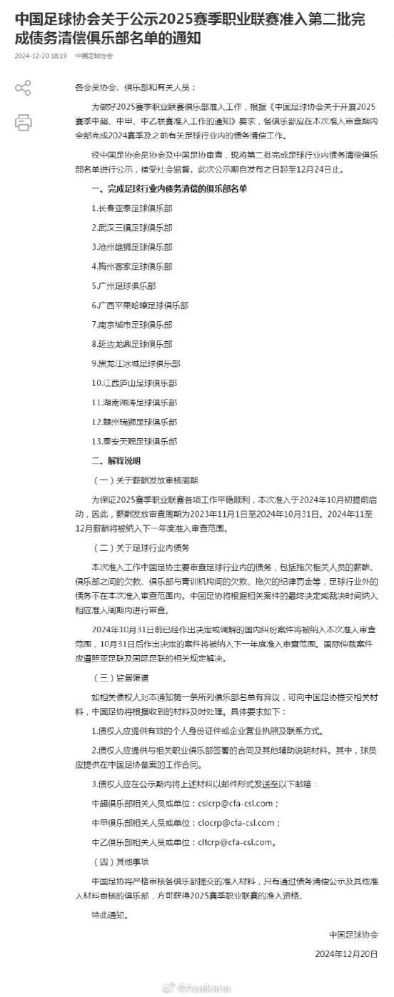 中國足協(xié)公示2025賽季職業(yè)聯(lián)賽準入第二批完成債務(wù)清償俱樂部名單,此前不在第一批名單里的長春亞泰、武漢三鎮(zhèn)、滄州雄獅、梅州客家、廣州、廣西平果哈嘹、南京城市、延邊龍鼎、黑龍江冰城、江西廬山、湖南湘濤、贛州瑞獅、泰安天貺全員上榜,相當于所有三級職業(yè)俱樂部都進行了完成債務(wù)清償?shù)墓尽????